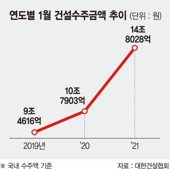 24일 대한건설협회와 건설업계에 따르면 올해 1월 국내 건설수주액은 14조8028억원으로 전월대비 49.8% 상승한 것으로 나타났다. 전년 동기와 비교하면 37.2% 상승한 수치다.