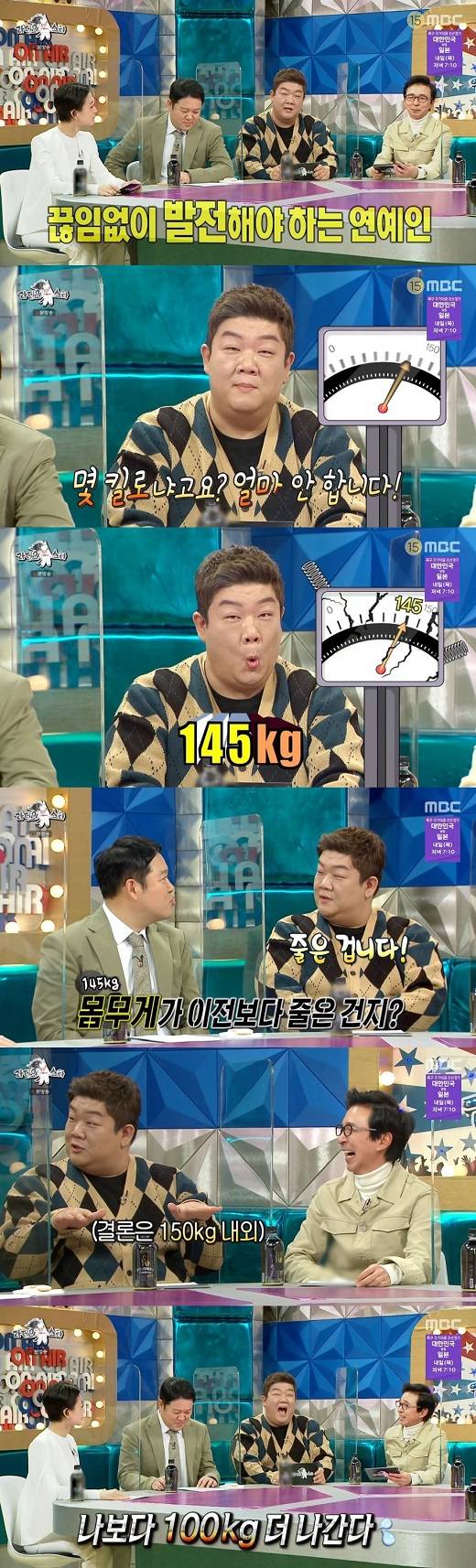 이날 스페셜 MC 유민상은 "연예인은 한 자리에 머물러 있으면 안 된다. 나는 몸무게가 계속 발전 중이다. 145kg이다. 계속 늘고 있다"고 고백해 모두를 놀라게 했다.