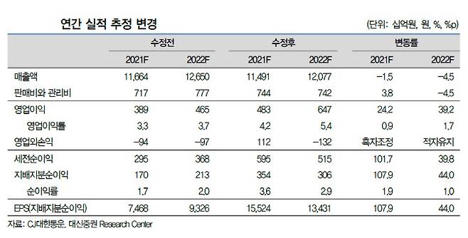 CJ대한통운, 단가 인상으로 실적 추정 상향..목표가↑ -대신