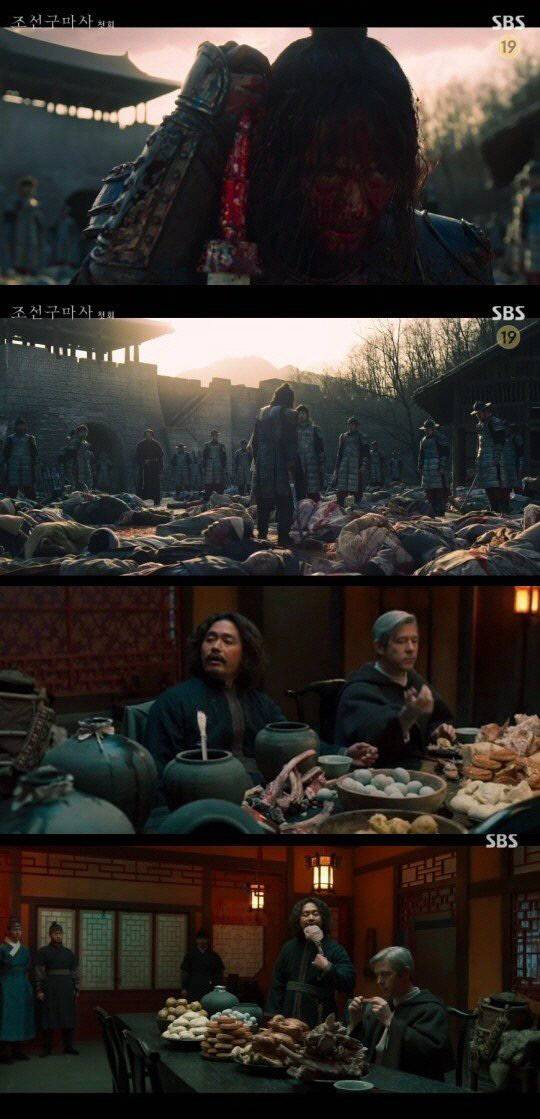 특히 기생집에서 중국 음식이 나온 장면을 보자 황현필 강사는 크게 분노했다. 기생집에서는 월병, 피단, 중국 술 등이 술상에 올랐다. ‘조선구마사’ 제작진은 “셋째 왕자인 충녕대군이 세자인 양녕대군 대신 중국 국경까지 먼 거리를 이동해 서역의 구마 사제를 데려와야 했던 상황을 강조하기 위해 ‘의주 근방(명나라 국경)’ 이라는 해당 장소를 설정했고 자막 처리했다. 명나라를 통해서 막 조선으로 건너 온 서역의 구마사제 일행을 쉬게 하는 장소였고, 명나라 국경에 가까운 지역이다 보니 ‘중국인의 왕래가 잦지 않았을까’ 하는 상상력을 가미해 소품을 준비했다”면서 “극중 한양과 멀리 떨어진 변방에 있는 인물들의 위치를 설명하기 위한 설정이었을 뿐, 어떤 특별한 의도가 전혀 없었다”고 해명했다.