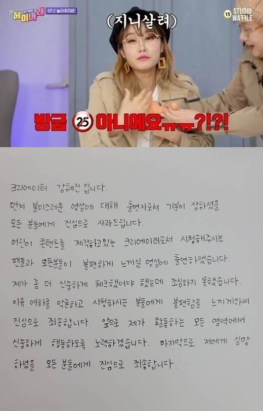 헤이지니는 25일 오후 자신의 인스타그램에 유튜브 채널 '스튜디오 와플' 웹예능 '헤이나래'와 관련 자필 사과문을 올렸다. 앞서 23일 공개된 2회 영상에서 함께 출연하는 박나래가 수위 높은 발언을 일삼으며 성희롱 논란을 일으켰던 바.