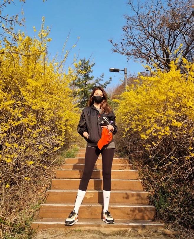 만발한 개나리를 배경으로 꽃구경 인증샷을 남긴 유인영은 스포티한 패션으로 건강한 매력을 발산했다.