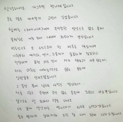 박나래는 25일 밤 자신의 인스타그램에 자필 사과문을 게재했다.