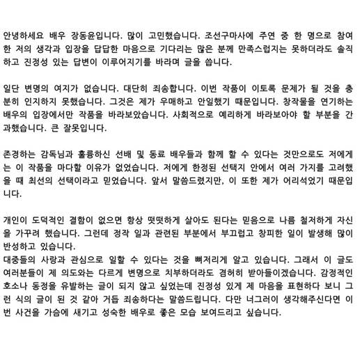 장동윤은 "변명의 여지가 없다. 대단히 죄송하다. 이번 작품이 이토록 문제가 될 것을 충분히 인지하지 못했다. 그것은 제가 우매하고 안일했기 때문이다. 창작물을 연기하는 배우의 입장에서만 작품을 바라보았다. 사회적으로 예리하게 바라보아야 할 부분을 간과했다. 큰 잘못이다"며 "개인이 도덕적인 결함이 없으면 항상 떳떳하게 살아도 된다는 믿음으로 나름 철저하게 자신을 가꾸려 했다. 그런데 정작 일과 관련된 부분에서 부끄럽고 창피한 일이 발생해 많이 반성하고 있다"고 밝혔다.