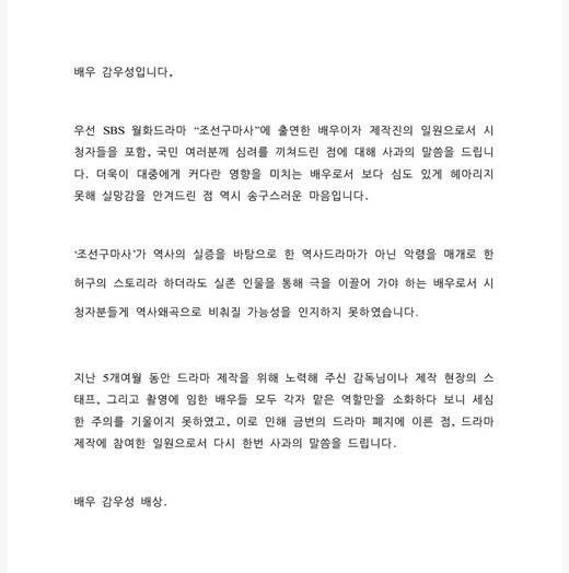 [마이데일리 = 김미리 기자] 드라마 '조선구마사'가 역사 왜곡 논란으로 폐지 된 가운데, PD와 작가를 비롯해 출연 배우들이 이번 논란과 관련해 사과했다.