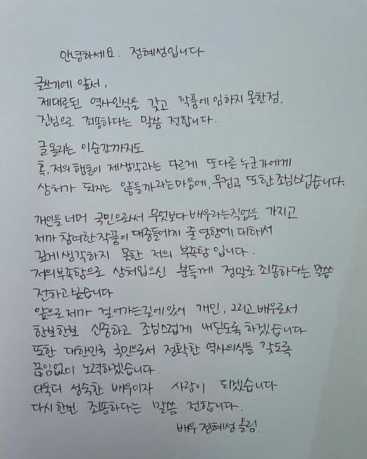 정혜선 역시 제대로 된 역사의식을 갖추지 못한 점을 사과하고 "개인을 넘어 국민으로서, 무엇보다 배우라는 직업을 가지고 제가 참여한 작품이 대중들에게 줄 영향에 대해 깊게 생각하지 못한 저의 부족함이다. 저의 부족함으로 상처를 입으신 분들께 정말로 죄송하다는 말씀, 전하고 싶다"며 "대한민국 국민으로 정확한 역사의식을 갖도록 끊임없이 노력하겠다. 더욱더 성숙한 배우이자 사람이 되겠다"고 밝혔다.
