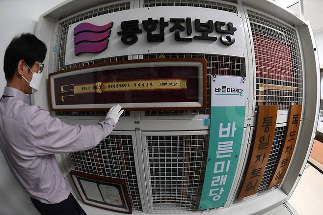 기록관리과 직원이 행정박물서고에 보관 중인 옛 민주당 현판을 살펴보고 있다.