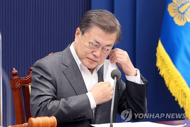 (서울=연합뉴스) 최재구 기자 = 문재인 대통령이 30일 오전 청와대에서 열린 제14회 국무회의에서 발언을 위해 마스크를 벗고 있다. 2021.3.30