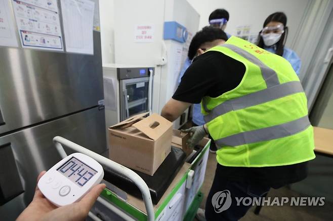 (서울=연합뉴스) 이지은 기자 = 30일 오후 서울 성북구 예방접종센터에 만 75세 이상 고령층 접종에 사용될 신종 코로나바이러스 감염증(코로나19) 예방 백신(화이자)이 도착해 한 관계자가 시간을 측정하고 있다. 2021.3.30