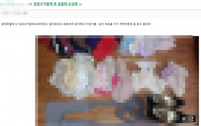 글쓴이는 "옷 정리할 때 다 헌옷수거함에 버려야 되는지 알아보려고 유튜브에 검색하다 이런 (영상)거를 발견했다"면서 "남의 속옷을 자기 구독자한테 돈 받고 팔더라"라며 황당해했다.