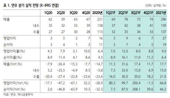 연우는 올해 1분기 연결 매출과 영업이익이 각각 전년동기대비 11%와 80% 성장한 690억원과 48억원 수준으로 분기 최대 실적이 예상된다. 내수 매출은 전년대비 8%, 수출 매출은 16% 증가하면서 외형 성장을 견인할 것으로 전망된다. 국내 주요 브랜드에 대한 매출은 2019년 수준을 넘어섰고, 중소형 브랜드와 OEM 업체에 대한 매출도 크게 증가할 것이라는 관측이다. 무엇보다 수출 매출이 빠르게 회복하고 있다는 평가다.