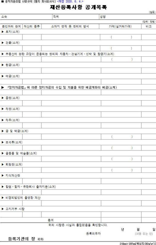 현재 공직자의 재산공개는 그 방식을 규정하고 있는 공직자윤리법 제10조제1항에 따라 재산 내역을 '관보 또는 공보'에 게재하고, 시행규칙 별지 제 10호 서식에 맞춰 PDF 형태의 문서로 공개합니다.
