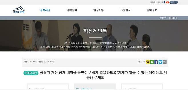 코드포코리아에서 대외 소통창구 역할을 하는 권오현(사회적 협동조합 빠띠 이사장) 오거나이저(코드포코리아에서는 파워 활동가를 이렇게 부른다)는 <한겨레>와 통화에서 이번 제안의 배경에 대해 “지금은 종이로 인쇄하거나 디지털 기기에서 읽기에만 적합한 이미지(PDF) 파일로 제공되는데다 공직자 재산 정보다 여러 곳에 흩어져 있어 시민들이 일목요연하게 보기 어렵고, 추이를 분석하거나 시각화해 활용하는 것도 어렵다”고 설명했다.
