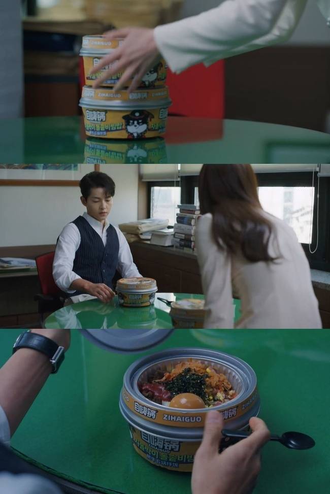 지난 14일 방송된 '빈센조' 8회에서는 빈센조(송중기 분)와 홍차영(전여빈 분)이 변호사 사무실에서 중국산 인스턴트 제품인 차돌박이 돌솥비빔밥을 먹는 모습이 그려졌다.