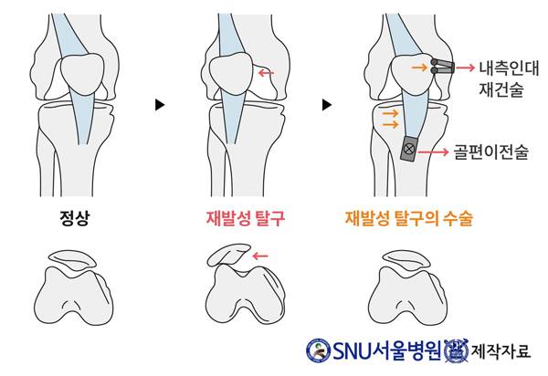 슬개골 탈구의 재발 위험이 높은 이유는 처음에 탈구된 원인에 대한 치료를 하지 않았기 때문이다. 제대로 치료를 하지 않으면 외상성 관절염과 슬관절 강직 등 합병증도 생길 수 있다. 때문에 슬개골이 자꾸 빠지게 되는 위험 인자를 정확히 파악할 수 있는 의사에게 진찰받아야 한다. 환자마다 다양한 원인으로 슬개골이 탈구되기 때문에 병원에 방문해 본인 상태에 어떤 치료가 적합할지 고려해야 한다. 수술하게 되면 재활 치료를 꾸준히 쉬지 않고 해야 하므로 환자 개인의 상태에 맞춰 재활을 도와줄 수 있는 회복전담팀이 있는 병원을 잘 골라가야 하겠다.