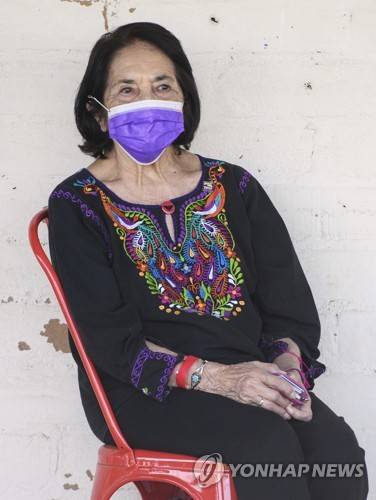 US labor leader and civil rights activist Dolores Huerta watches as first lady Jill Biden speaks to farm workers at The Forty Acres, the first headquarters of the United Farm Workers labor union, in Delano, Calif., Wednesday, March 31, 2021. (Mandel Ngan/Pool via AP) POOL IMAGE