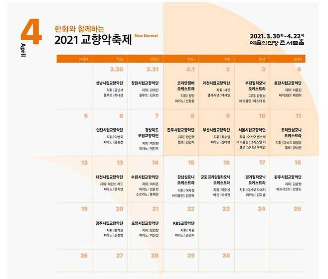지난주에도 말씀드렸지만 예술의전당에서 매년 열리는 대규모 클래식 음악축제 '교향악축제'가 30일에 개막했습니다. 국내 대표 교향악단과 솔리스트들이 '총출동'하는데요, 예술의전당 콘서트홀에서 현장 공연을 진행하면서 예술의전당 야외광장-온라인-라디오 3원 생중계를 병행합니다. 월요일 제외한 평일에 저녁 7시반, 토요일과 일요일은 오후 5시에 시작합니다. 온라인 생중계는 예술의전당 네이버TV에서 볼 수 있습니다. [▶바로가기]
