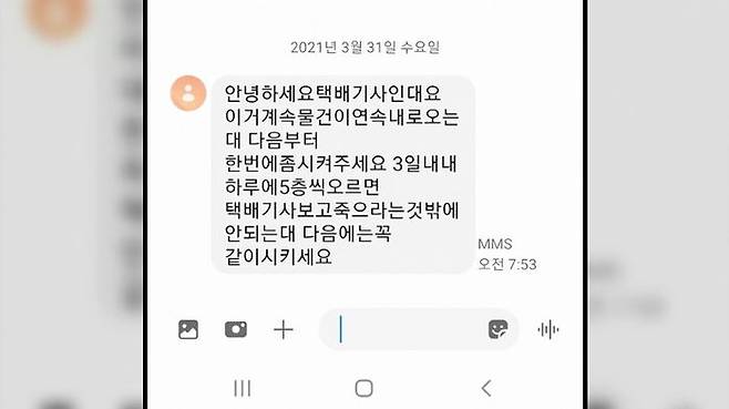 지난달 31일 한 온라인 커뮤니티에는 '택배기사에게 항의 문자를 받았다'는 글이 올라왔습니다.