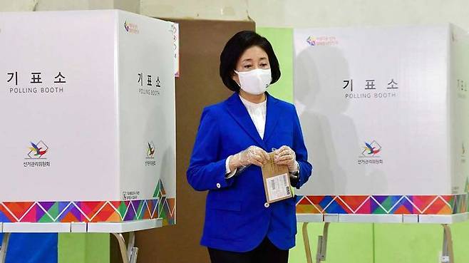 종로구청에 마련된 사전투표소를 찾아 기표 마치고 나오는 박영선 민주당 서울시장 후보