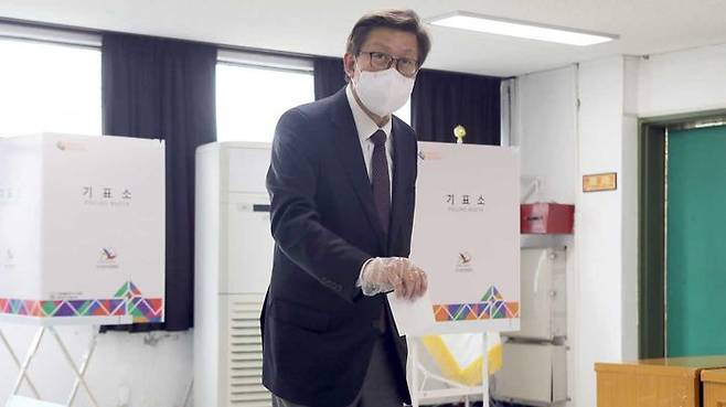 부산 해운대구청에 마련된 사전투표소를 찾아 투표하고 있는 박형준 국민의힘 부산시장 후보