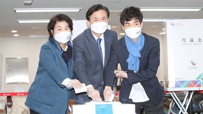 부산진구 전포 제2사전투표소를 찾아 가족과 함께 투표하고 있는 김영춘 민주당 부산시장 후보