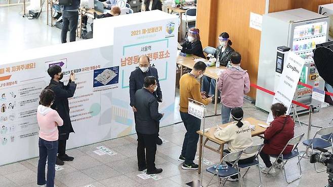 사전투표 첫날인 2일 오전 서울역에 설치된 남영동 사전투표소를 찾은 시민들