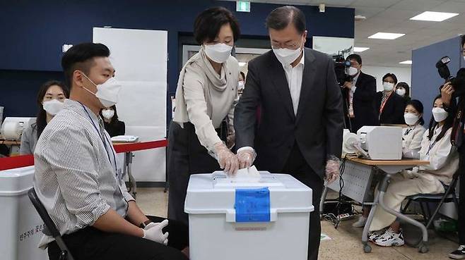 오늘(2일) 오전 서울 종로구 삼청동주민센터를 찾아 4·7 재보궐선거 사전투표 하는 문재인 대통령과 부인 김정숙 여사