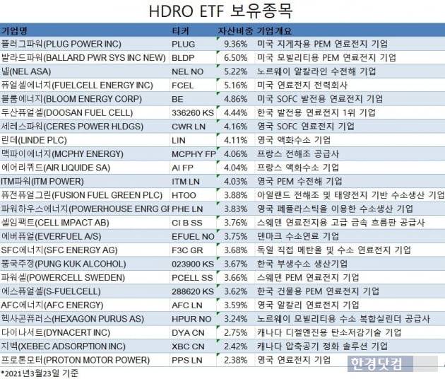 이밖에 HDRO 상위종목으로는 두산퓨얼셀을 비롯해 영국 SOFC 연료전지기업 세레스파워, 영국 액화수소 기업 린데, 프랑스 전해조 공급사 맥파이, 프랑스 액화수소기업 에어리퀴드, 영국 PEM 기반 수전해 기업 ITM파워 등이 있습니다.