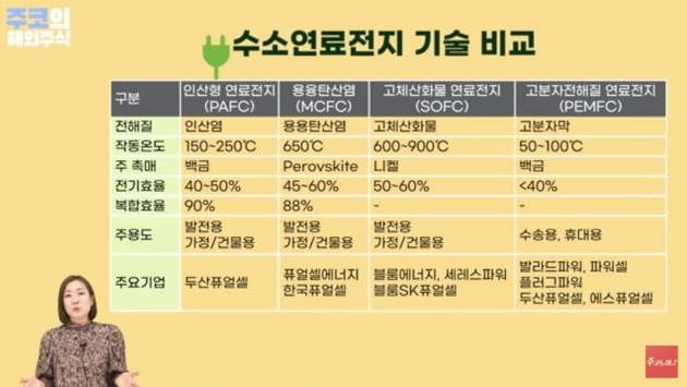 조금 전문적인 얘기지만 연료전지를 전해질에 따라 구분하는 게 정석인데요. 기술발전 수준에 따라 4가지로 구분할 수 있습니다.