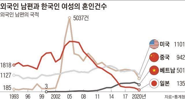 반면 베트남 남편은 해마다 꾸준히 늘고 있어 눈길을 끈다. 베트남 남성과 한국인 여성이 결혼해 통계에 잡힌 것(1993년 이후)은 2000년(3건)이 처음인데, 해마다 늘어나 2019년에는 639건을 기록했다. 한 결혼 정보 업체 관계자는 “한국인 남성과 결혼하는 베트남 여성이 많아지면서, 덩달아 증가하는 추세”라고 말했다.