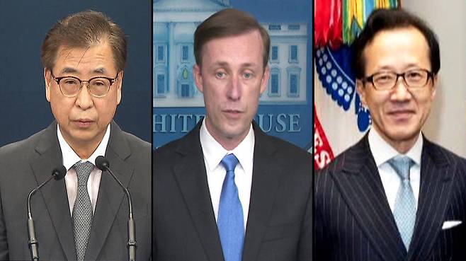 서훈 청와대 국가안보실장과 제이크 설리번 백악관 국가안보보좌관, 기타무라 시게루 일본 국가안보국장은 이날 워싱턴DC 인근 해군사관학교에서 대면 회의를 개최한 뒤 백악관이 배포한 한미일 안보실장 언론성명에서 이같이 밝혔습니다.
