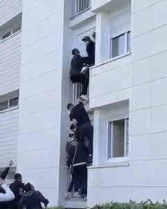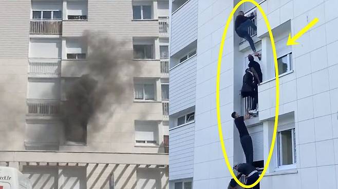점차 심각해지는 화재 상황에 이웃들은 차례로 발코니 난간을 붙잡고 올라가기 시작했습니다. 별다른 구조 수단이 없자 직접 '인간 사다리'를 만들어 구조하는 방법을 택한 겁니다.