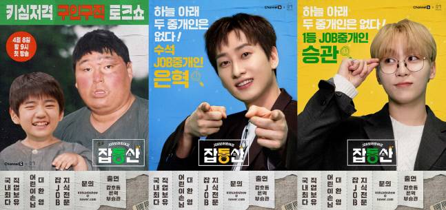 오는 8일 목요일 밤 9시 첫 방송되는 채널S의 새 예능 프로그램 '잡동산'(SM C&C STUDIO 제작/ 조현정 연출) 측은 3일 강호동의 패러디 포스터와 잡(JOB,직업) 중개인 은혁-승관의 캐릭터 포스터를 공개했다.