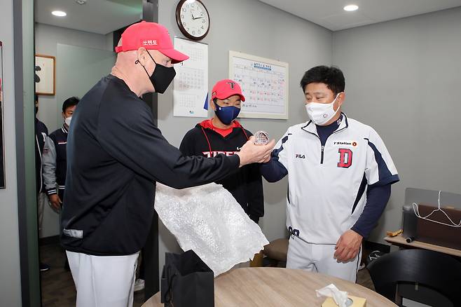 맷 윌리엄스 KIA 타이거즈 감독은 4월3일 서울 잠실야구장에서 열리기로 했던 두산 베어스와의 2021시즌 개막전에 앞서 김태형 두산 감독을 찾았다. 바로 특별한 선물을 증정하기 위해서다.