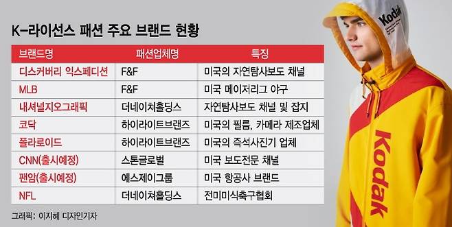많은 사람들이 잘못 알고 있는 것과 달리 '내셔널지오그래픽 어패럴'은 한국 브랜드다. 이 브랜드는 코스닥 상장사 더네이쳐홀딩스가 2016년 내셔널지오그래픽협회로부터 라이선스를 취득해 패션 브랜드화에 성공했다. MLB와 디스커버리 익스페디션, 코닥, CNN도 모두 한국 업체가 라이선스를 들여와 패션 브랜드로 만든 K-패션이다.