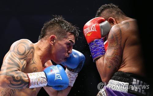 epa09114778 Pablo Carrillo (L) of Colombia in action against Donnie Nietes (R) of the Philippines during the D4G Promotions' Legacy Fight Night Boxing match in the Gulf emirate of Dubai, United Arab Emirates, 03 April 2021. EPA/ALI HAIDER
