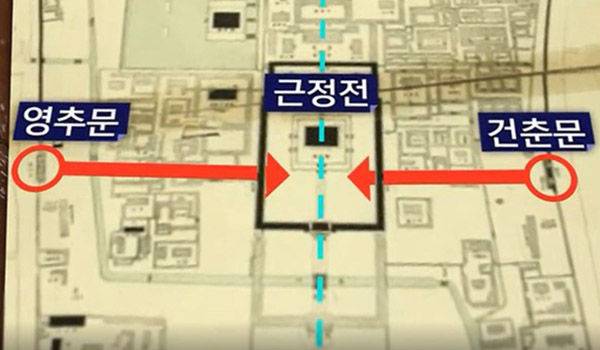 국왕의 즉위식이나 대례가 거행됐던 근정전을 중심으로 정문이자 남문인 광화문과 북문인 신무문이 축이 됐고 동문인 건춘문과 서문인 영추문이 좌우 대칭을 이뤘습니다. 유교사회에서 군왕이라는 것이 조화, 중용의 도를 현실에서 구현하는 사람이라는 의미를 담고 있기 때문에 상하, 좌우, 동서남북의 정확한 방형 대칭 구조를 가지고 궁궐이 만들어지는 것이 궁궐 건축의 대원칙이었던 겁니다.