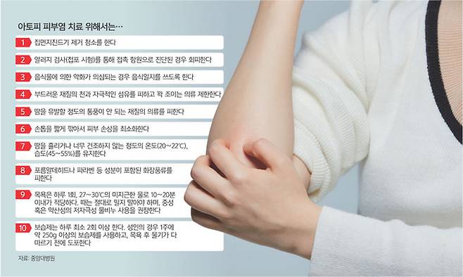 아토피는 만성질환이므로 약에만 의존하기보다는 실내 환경 개선이 병행돼야 한다. 실내 온도는 20∼22도, 습도는 45-55%를 유지하고 피부염을 악화시키는 집먼지 진드기가 주로 서식하는 천 소파, 카펫, 침대 등의 사용을 피해야 한다. 또 과도한 스트레스나 긴장은 가려움을 일으키는 원인이 되므로 자신만의 스트레스 해소법을 개발하는 것이 좋다.