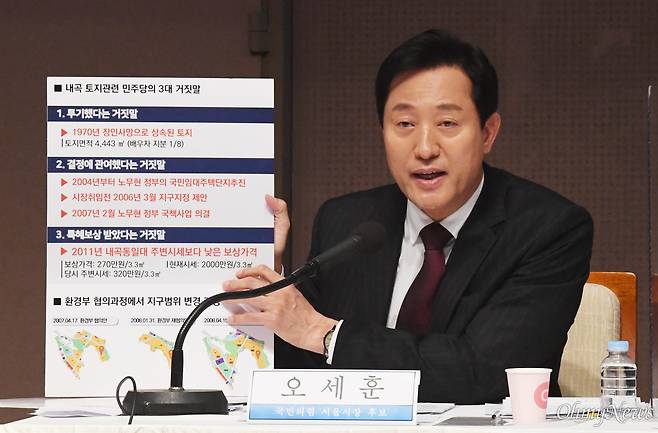| ▲ 국민의힘 오세훈 서울시장 후보가 31일 오전 한국프레스센터에서 열린 서울시장 후보 초청 관훈토론회에서 '내곡동 땅의혹' 관련 질문에 답변하고 있다. |