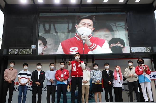 | ▲ 국민의힘 오세훈 서울시장 후보가 4일 오후 서울 광진구 아차산역 앞에서 열린 '청년마이크' 현장을 방문, 발언하고 있다. |
