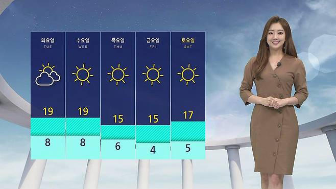 이번 한 주 별다른 비 예보 없이 쭉 맑은 날씨가 이어지겠고요, 아침에는 쌀쌀하고 낮 동안은 포근한 전형적인 봄 날씨가 쭉 이어지겠습니다.