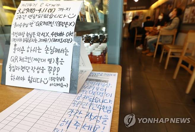 5일 서울시내 한 커피숍에 놓인 출입명부에 안내 문구가 쓰여 있다. 2021.4.5