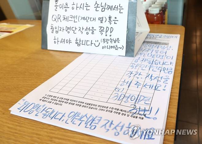 5일 서울시내 한 커피숍에 놓인 출입명부에 안내 문구가 쓰여 있다. 2021.4.5