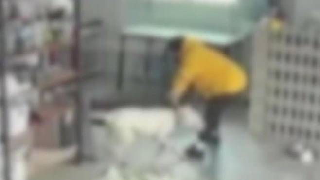 갑자기 개가 오른쪽 다리를 물고, 직원이 넘어집니다.