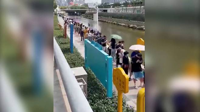 강 옆으로 사람들이 길게 줄을 서 있습니다.