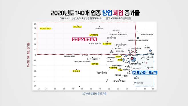 YTN 데이터 저널리즘팀은 코로나19가 우리나라 경제에 미친 영향을 살펴보기 위해 전국 190개 업종 개· 폐업 정보가 담긴 행정안전부 지방행정 인허가 데이터 약 824만 건을 분석했습니다. 1년 사이 개·폐업건 수의 변화가 10곳 미만이었던 50개 업종은 제외하고, 남은 140개 업종의 개·폐업 현황을 시각화했습니다. X축에는 2019년 대비 2020년의 창업 성장률을, Y축에는 폐업 증가율을 사분면에 표시하자 업종별 상황을 한눈에 살펴볼 수 있었습니다.