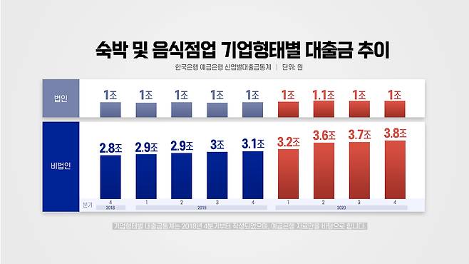 특히 숙박 및 음식점업은 지난 한 해 동안 총대출금이 약 1.3조 원만큼, 재작년 대비 약 20% 이상 증가했습니다. 증가한 금액의 약 20% 만이 시설 설치 등 장기 투자 목적으로 빌리는 시설자금이고, 나머지 80 %는 사업을 유지하기 위한 목적으로 빌리는 운전자금이었습니다. 미래를 보고 투자하는 업소보다 당장 사업장의 유지를 위해 돈을 빌려 생존하는 업소가 훨씬 더 많았을 가능성이 높습니다. 기업 형태별로 살펴보면, 법인 음식점(보통 연 매출 8-10억 원 이상)과 비법인 음식점 간에 대출금 증가 폭이 뚜렷하게 차이가 났습니다.