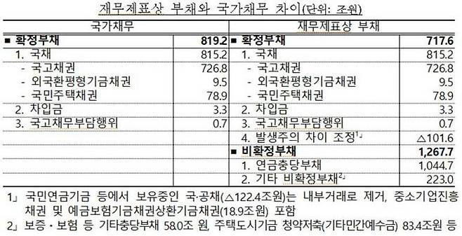 국제통화기금(IMF) 등 국가 간 재정건전성을 비교할 때 사용되는 국가채무(D1)에는 확정 부채만 포함되고 비확정 부채는 제외됩니다.