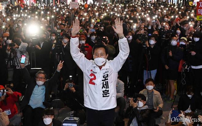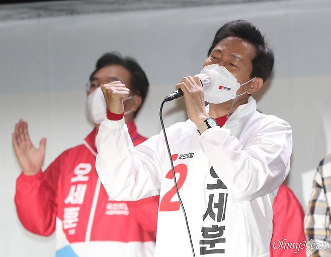 | ▲ 국민의힘 오세훈 서울시장 후보가 6일 서울 서대문구 신촌에서 열린 마지막 유세에서 지지를 호소하고 있다. |