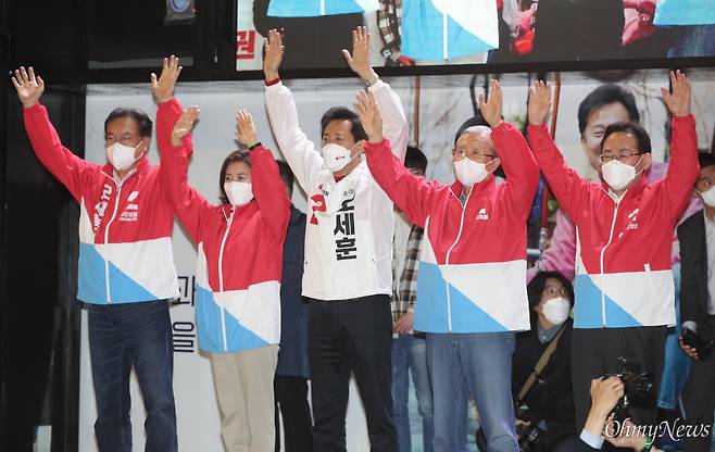 | ▲ 국민의힘 오세훈 서울시장 후보가 6일 오후 서울 서대문구 신촌역에서 열린 마지막 집중유세에서 지지연설에 나선 청년 등과 손을 잡고 시민들에게 인사하고 있다. |
